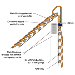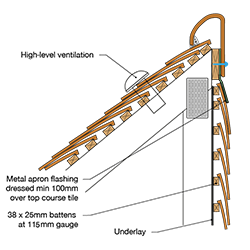 Install vent tiles spaced to provide the equivelant of 5000 sq mm per metre high level ventilation to the main roof space.