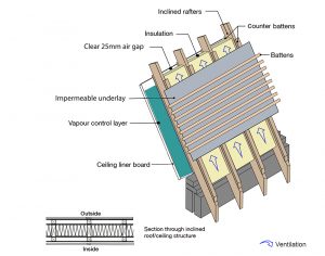 It is recommended that a clear ventilated air gap no less than 25mm must be positively ventilated in accordance with Approved Document C of the English building regulations (and its national equivalents in Scotland, Northern Ireland and Wales) between the underlay and the insulation.